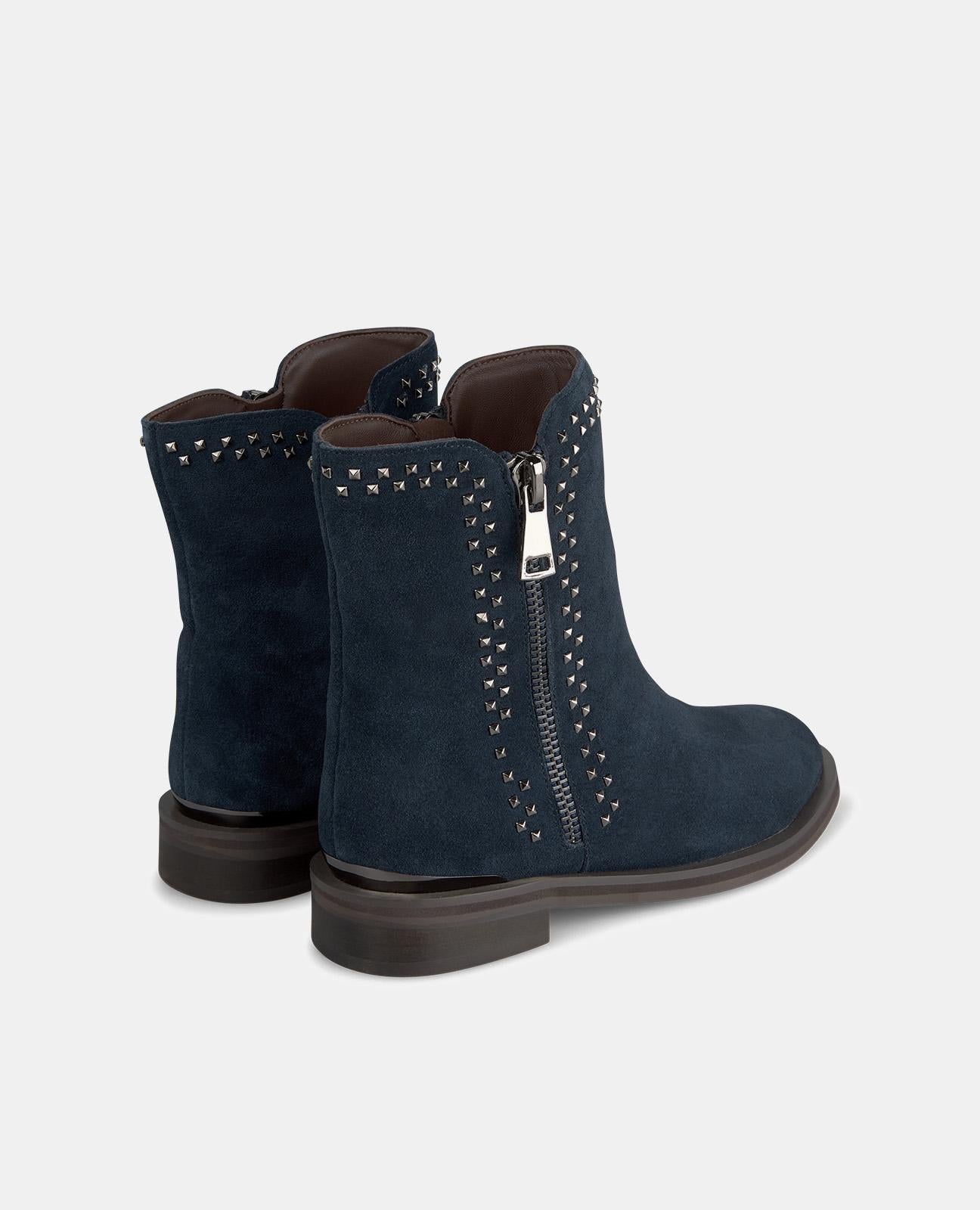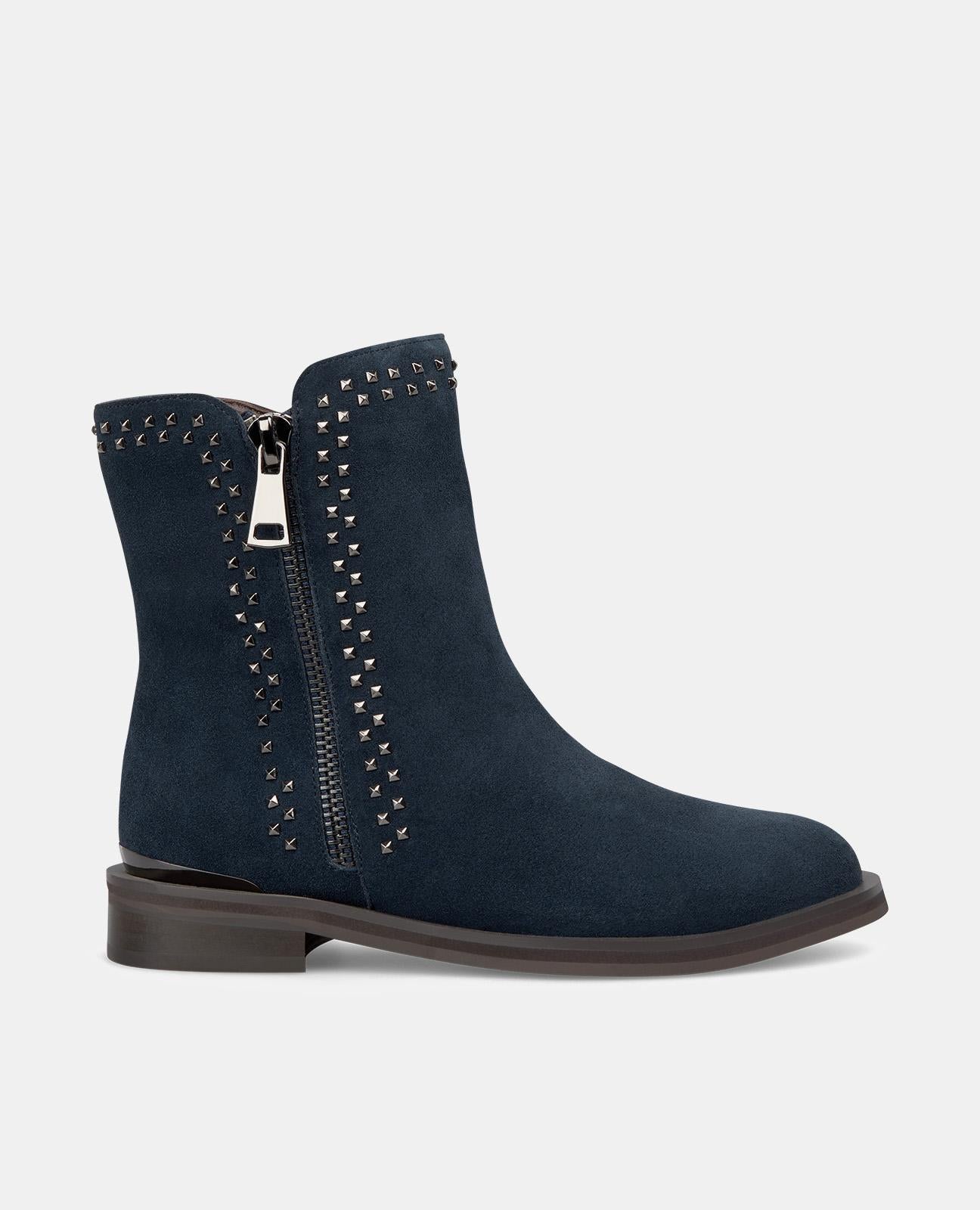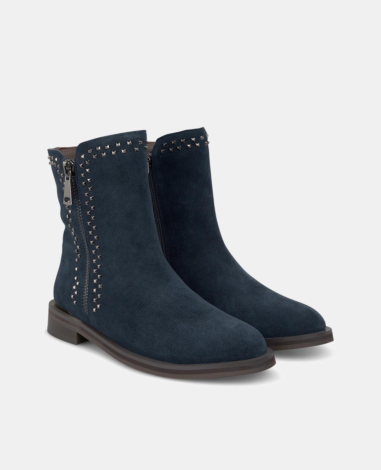 Women's flat ankle boots with lateral zipper. Made in leather with studs around the zipper. The height of the heel is 3cm and the height of the shaft is 15cm.