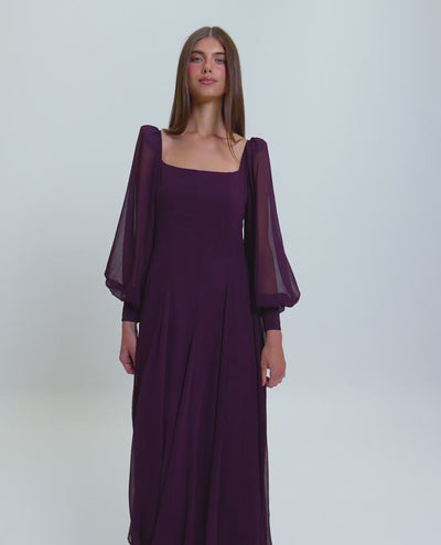 Vestido de mujer con manga abullonada semitransparente, falda larga con vuelo y cierre con cremallera en la espalda. Con escote cuadrado. Confeccionado en viscosa y nailon. Las medidas de la modelo vistiendo la talla S son: altura 1,68cm, pecho 87cm, cintura 63cm y cadera 88cm.