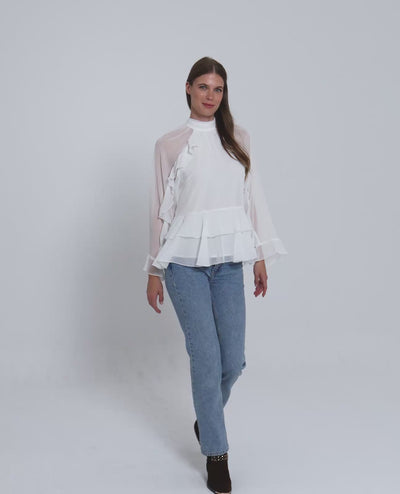 Blusa de mujer con volantes. Con cuello alto y manga larga semitransparente. Cierre trasero con botones. Las medidas de la modelo vistiendo la talla S son: altura 1,68cm, pecho 87cm, cintura 63cm y cadera 88cm.