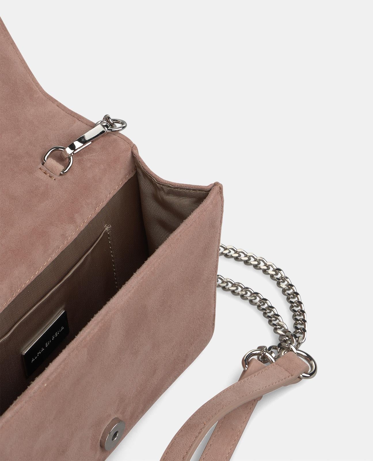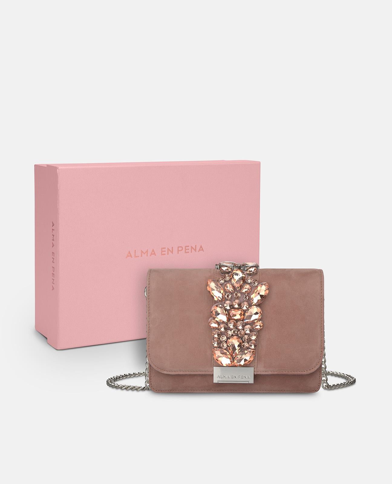 Bolso formato bandolera con cuerpo estilo caja. Detalle de joya en la solapa delantera, grabada con el logo. Interior con forro textil. Asa de cadena función bandolera. Cierre mediante imán.