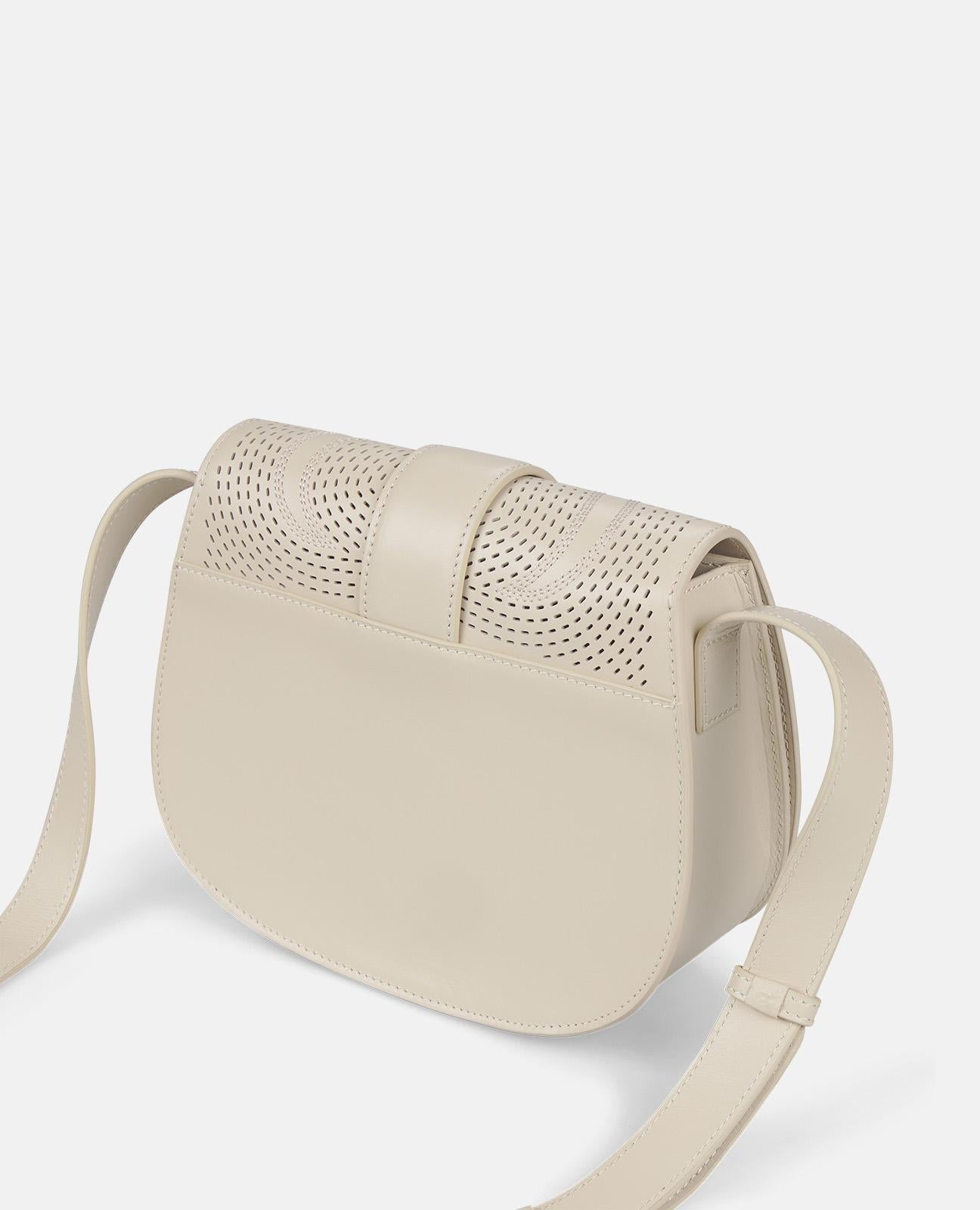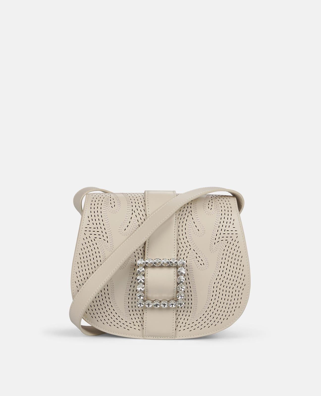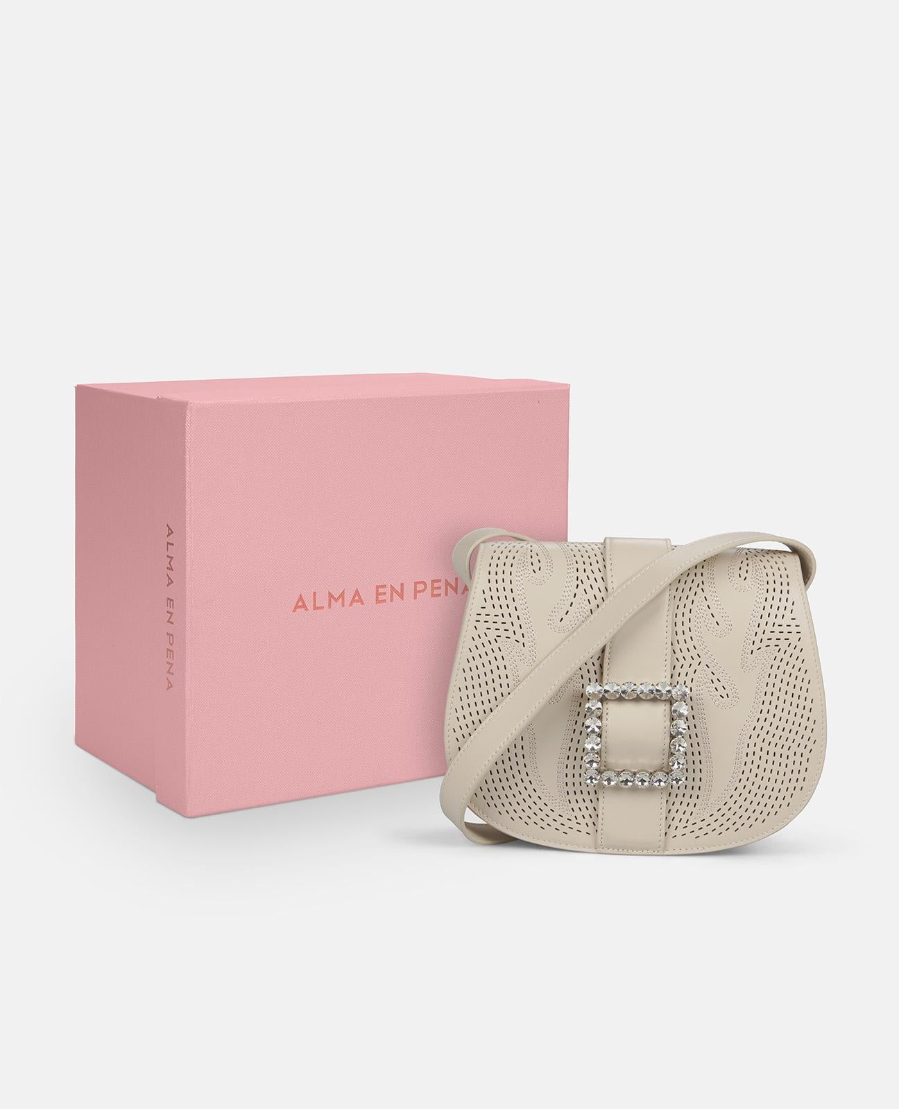 Bolso de hombro con detalles calados en la solapa. Detalle de hebilla con pedrería. Interior con forro textil. Cierre mediante imán.