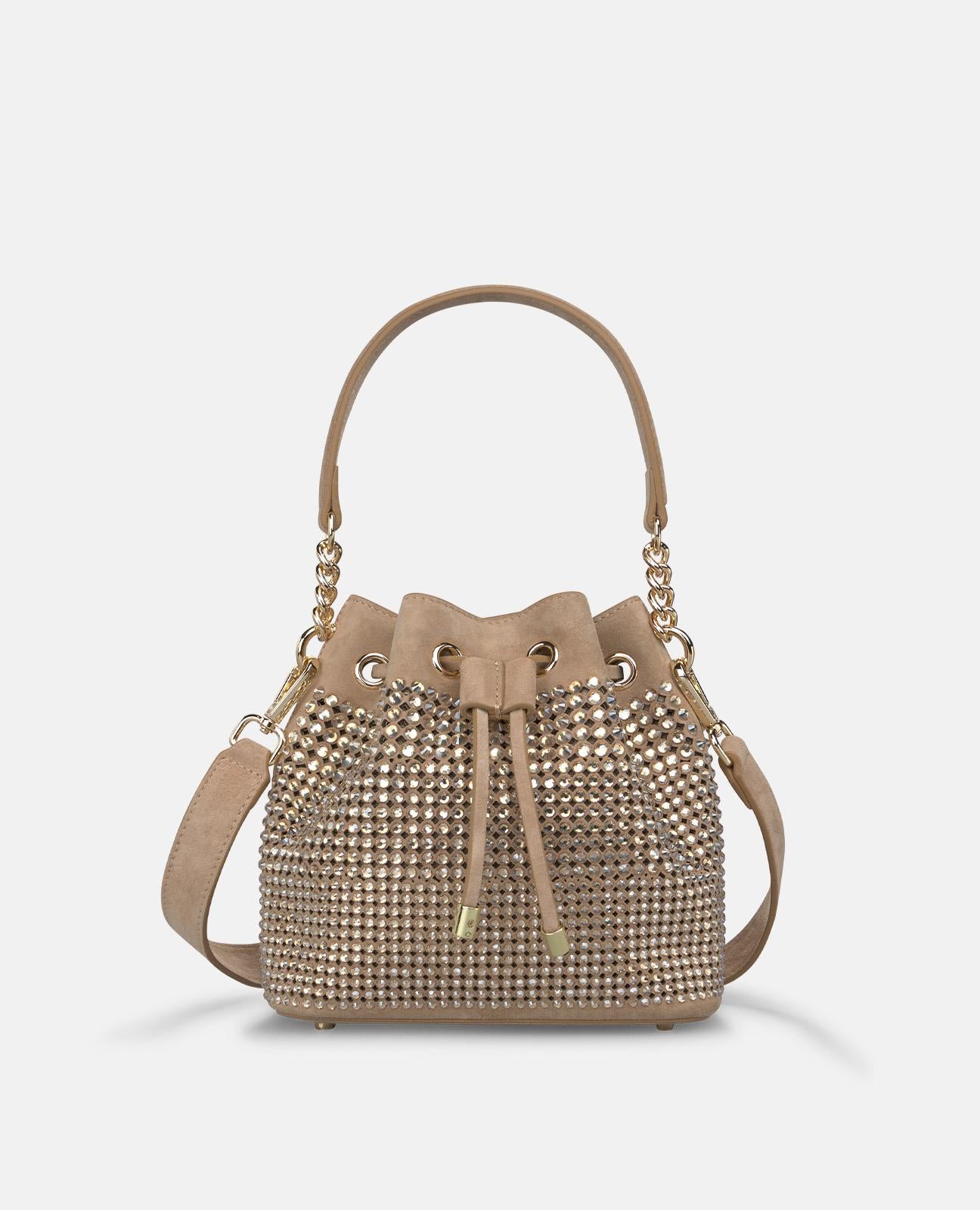 Bombonera realizada en textil con forro interior textil cubierta con pedrería. Cierre ajustable. Asa metálica circular y cadena metálica función bandolera.