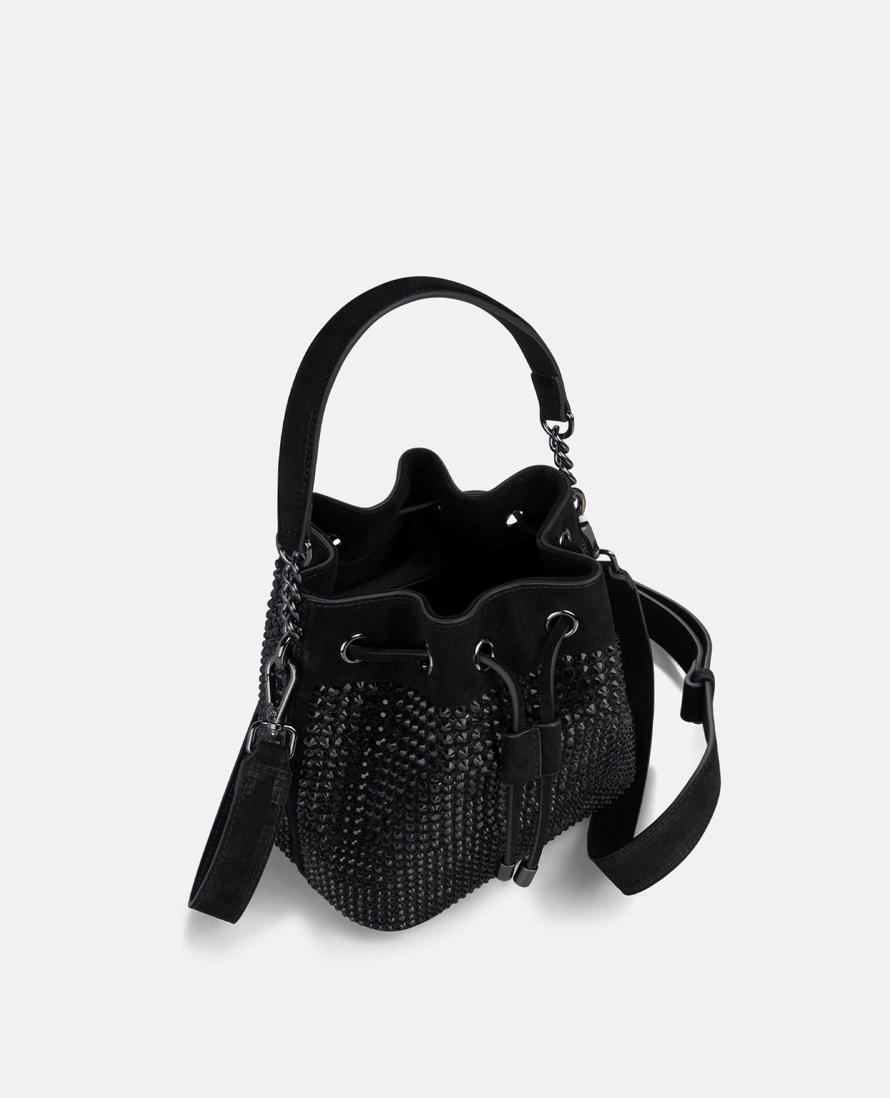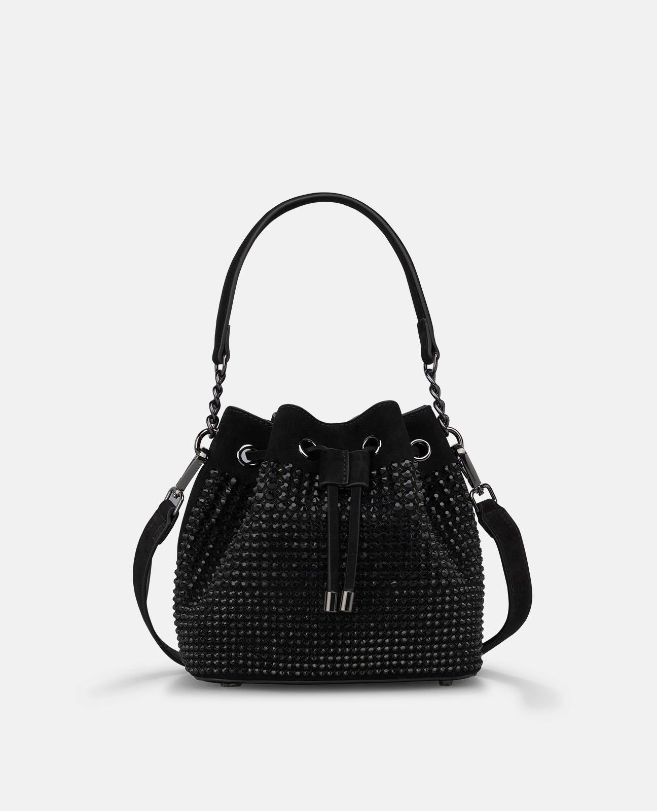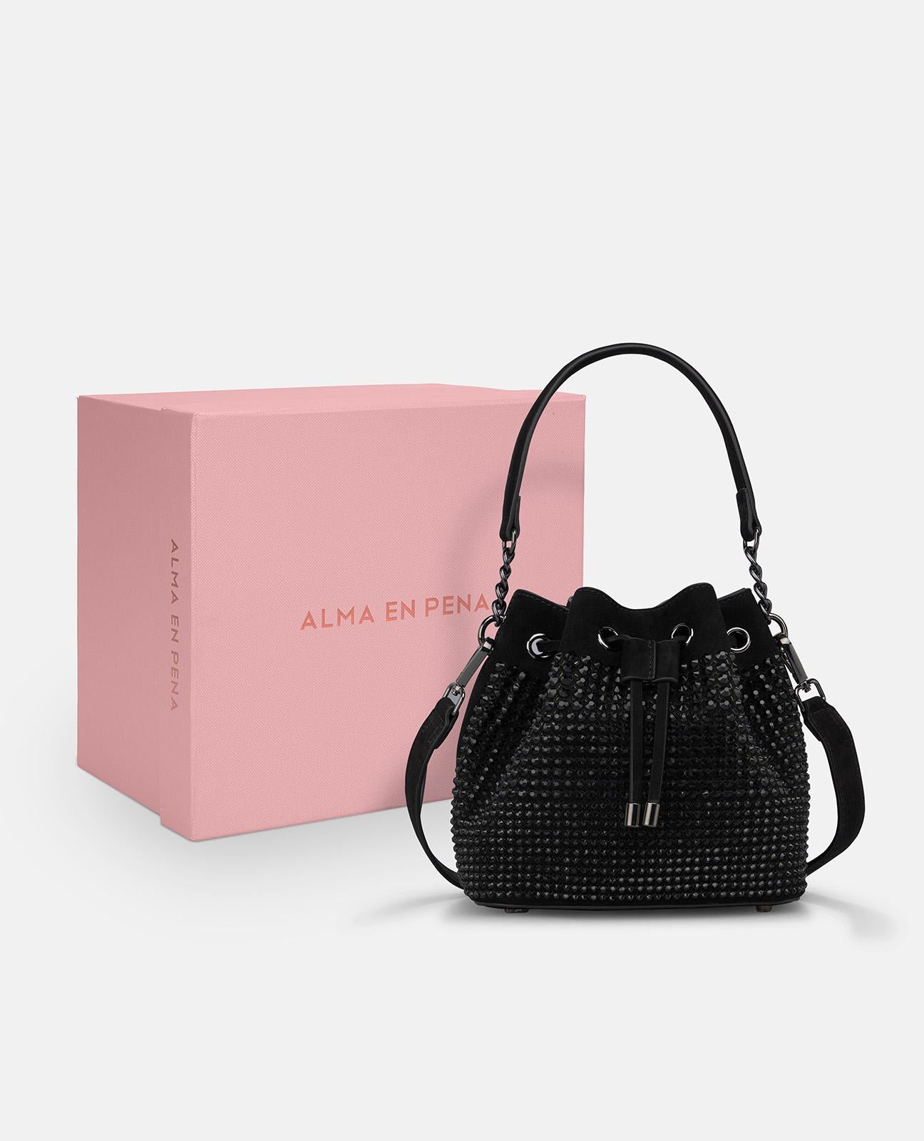 Bombonera realizada en textil con forro interior textil cubierta con pedrería. Cierre ajustable. Asa metálica circular y cadena metálica función bandolera.