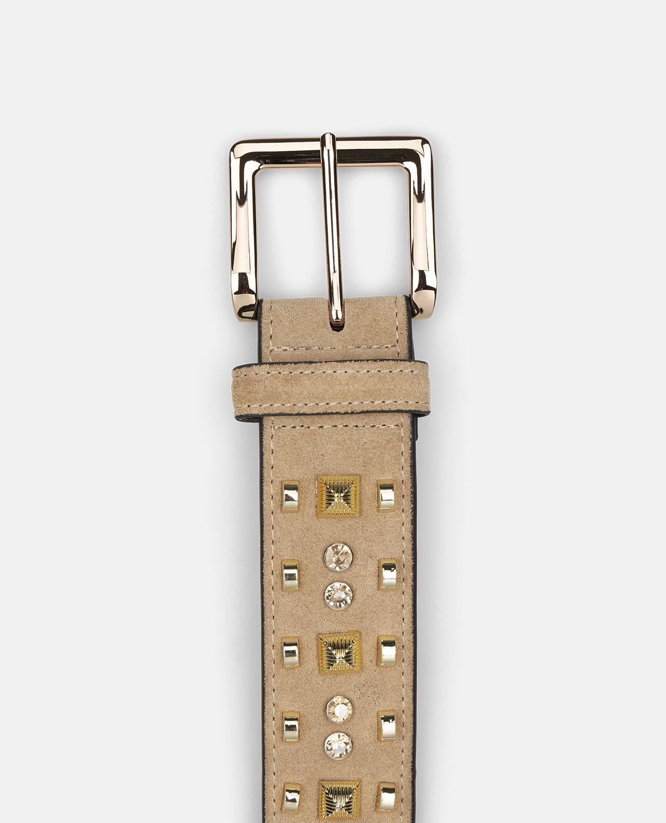 Cinturón de 4 cm de ancho realizado en piel con detalles. Hebilla metálica cuadrada.