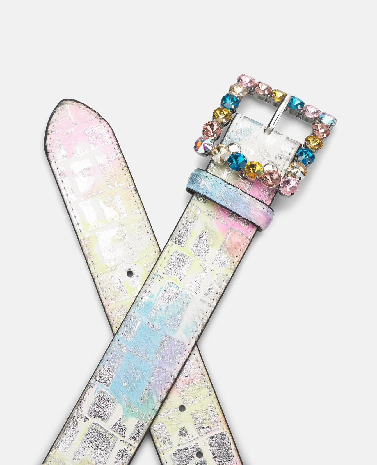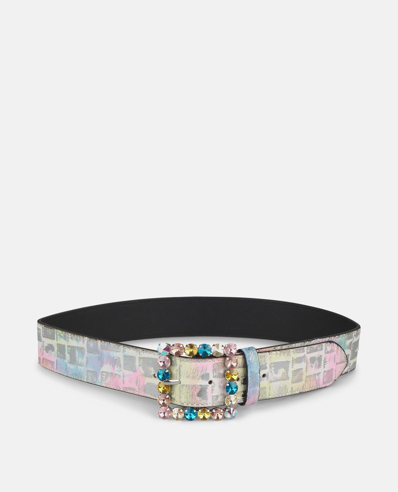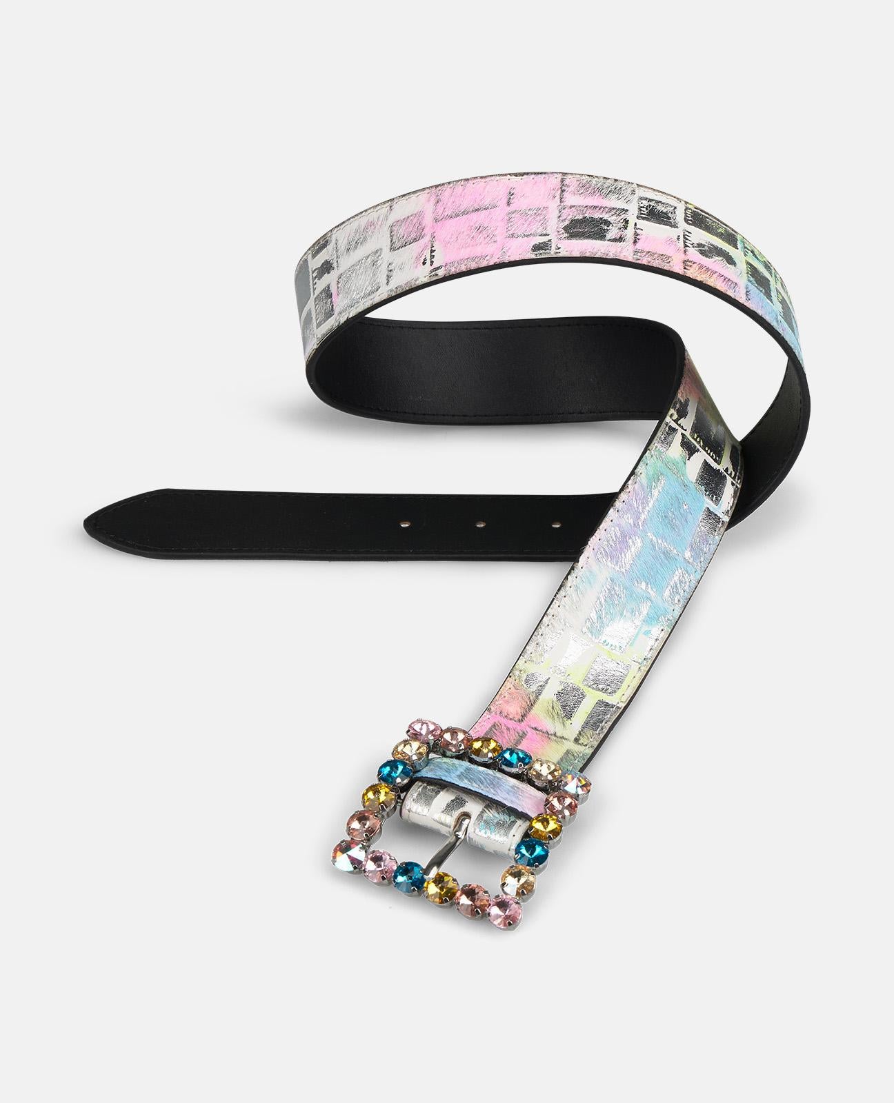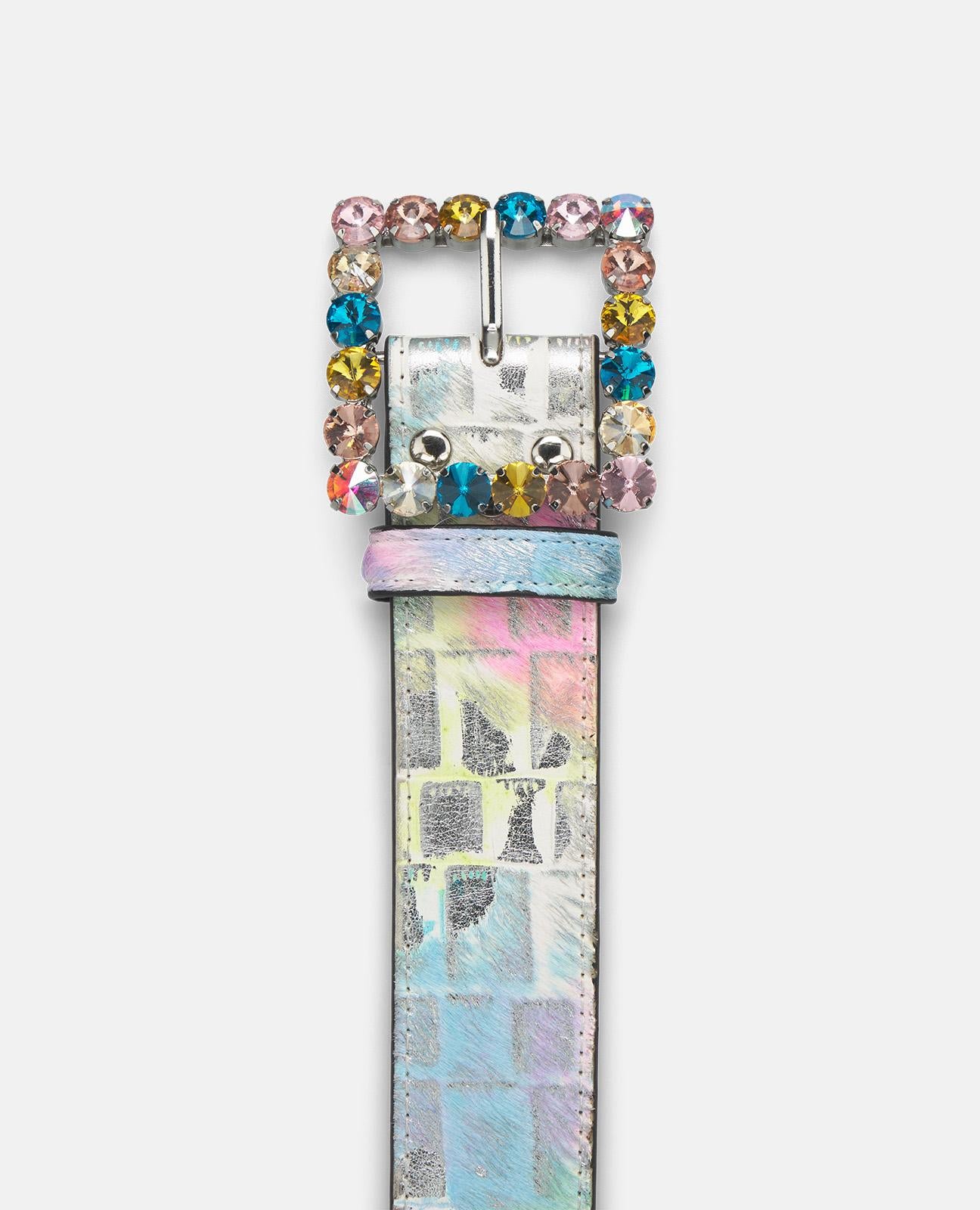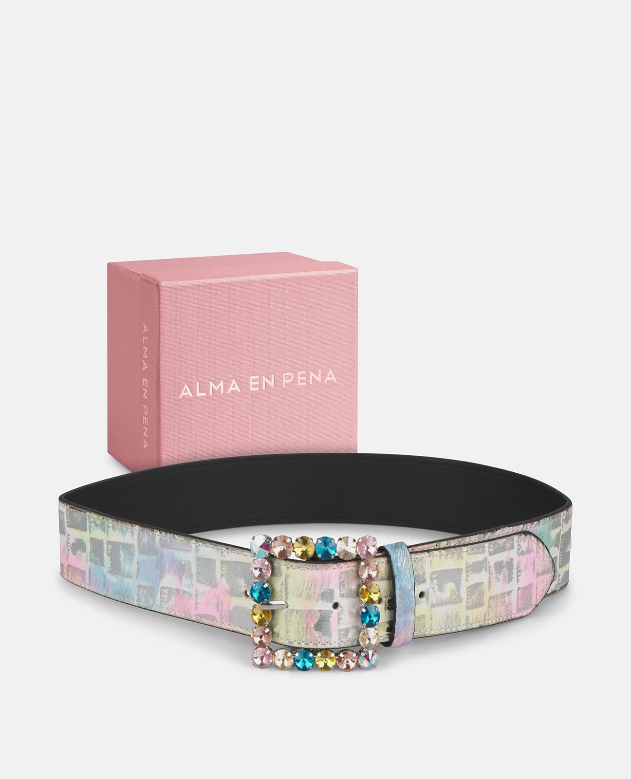 Cinturón de 4 cm de ancho realizado en piel. Hebilla metálica cuadrada con detalles de pedrería.