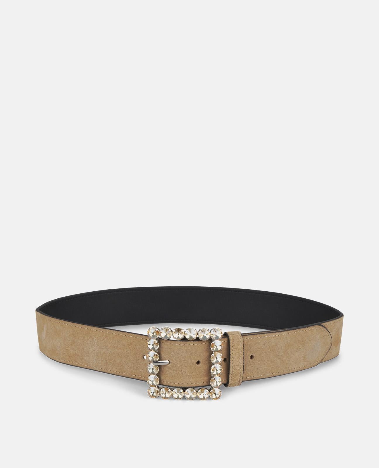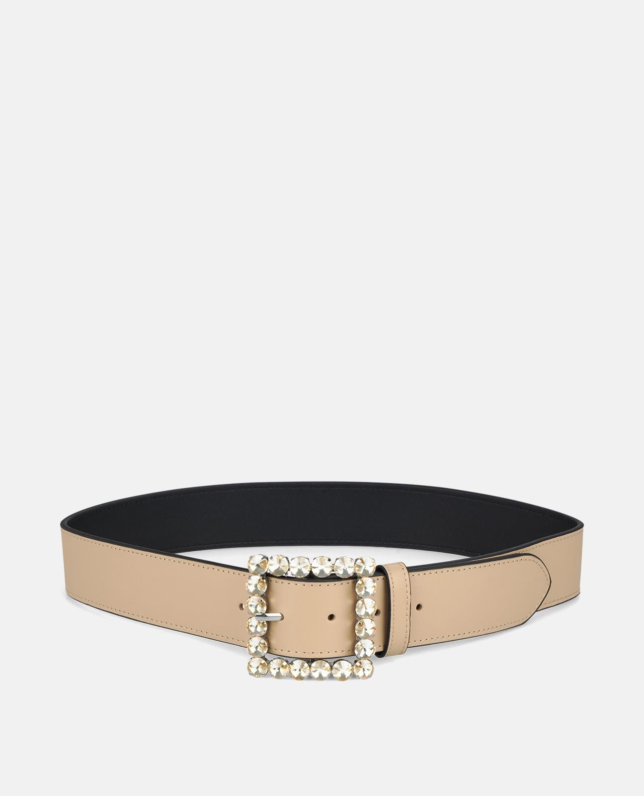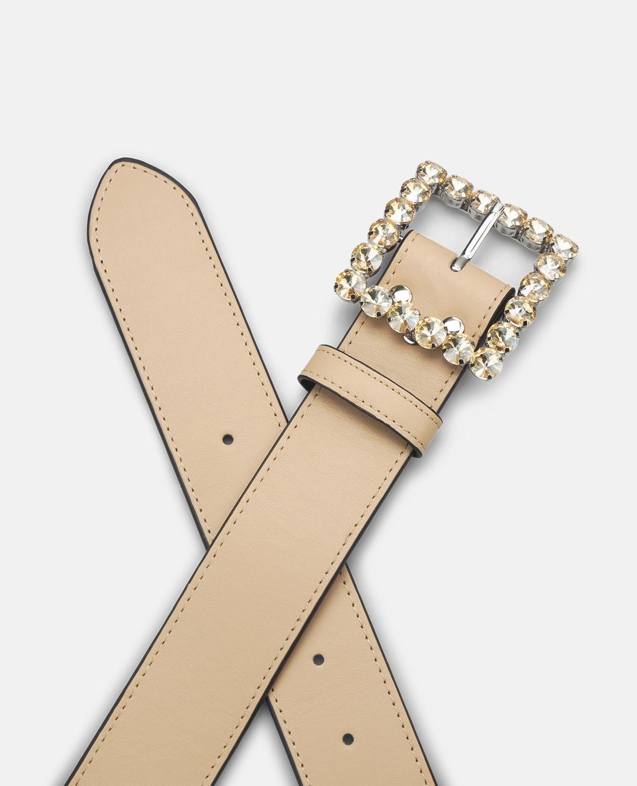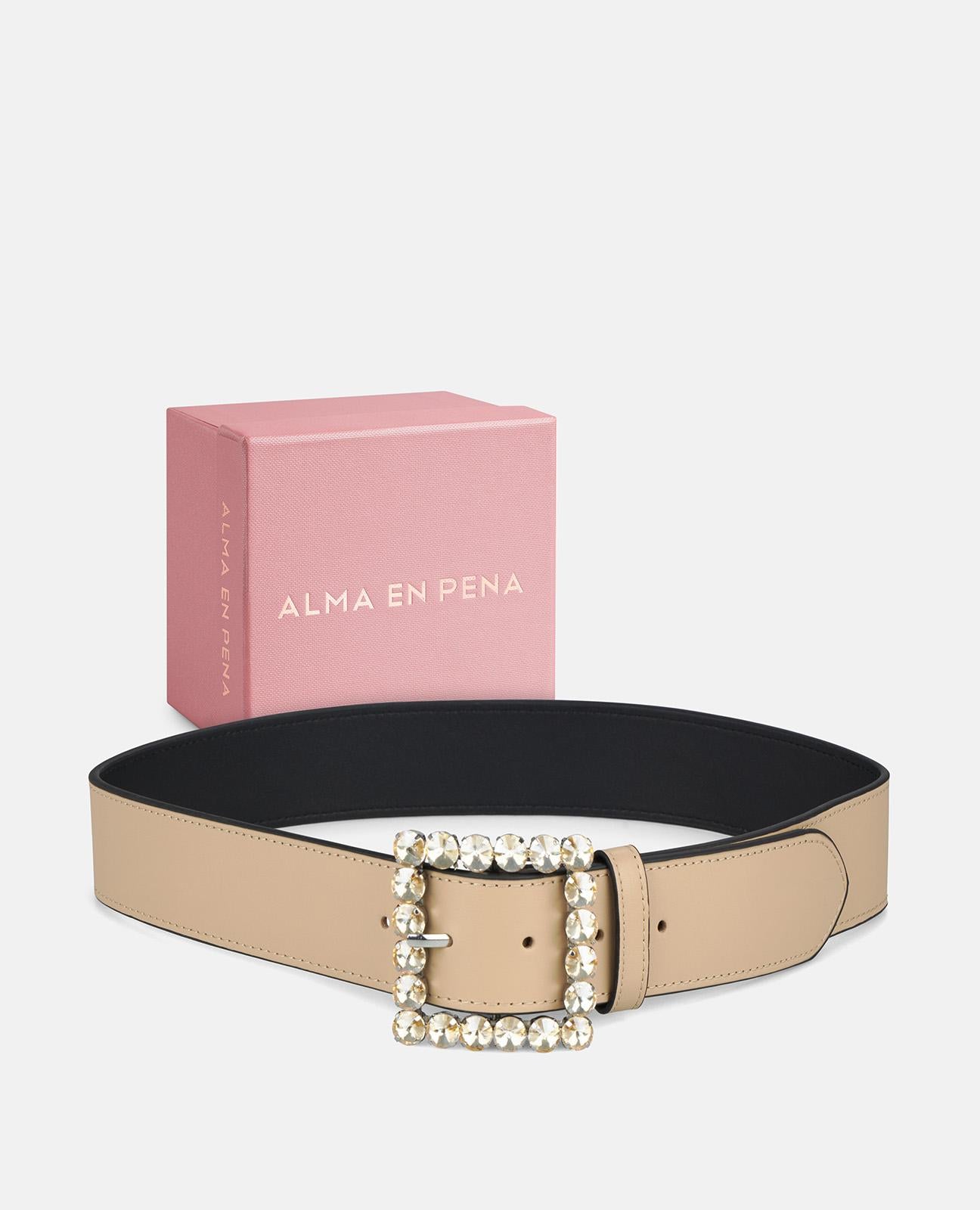 Cinturón de 4 cm de ancho realizado en piel. Hebilla metálica cuadrada con detalles de pedrería.