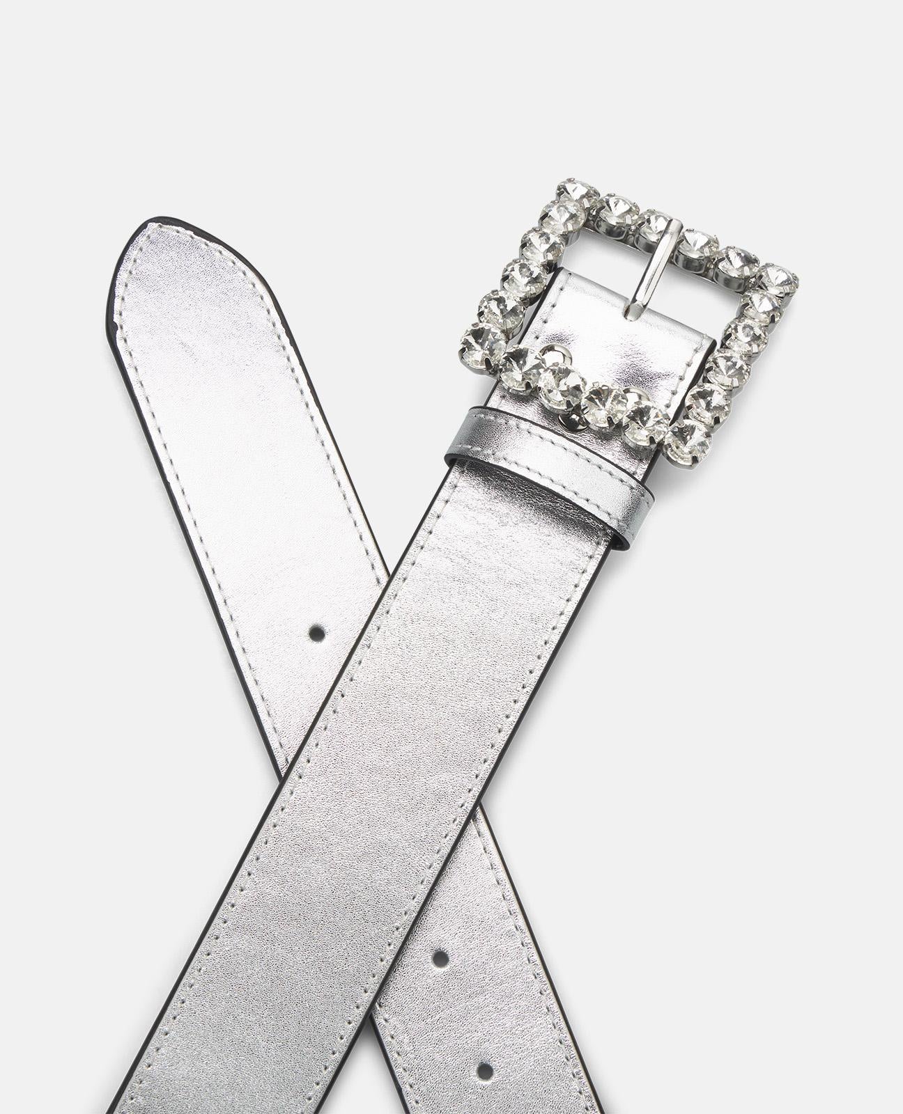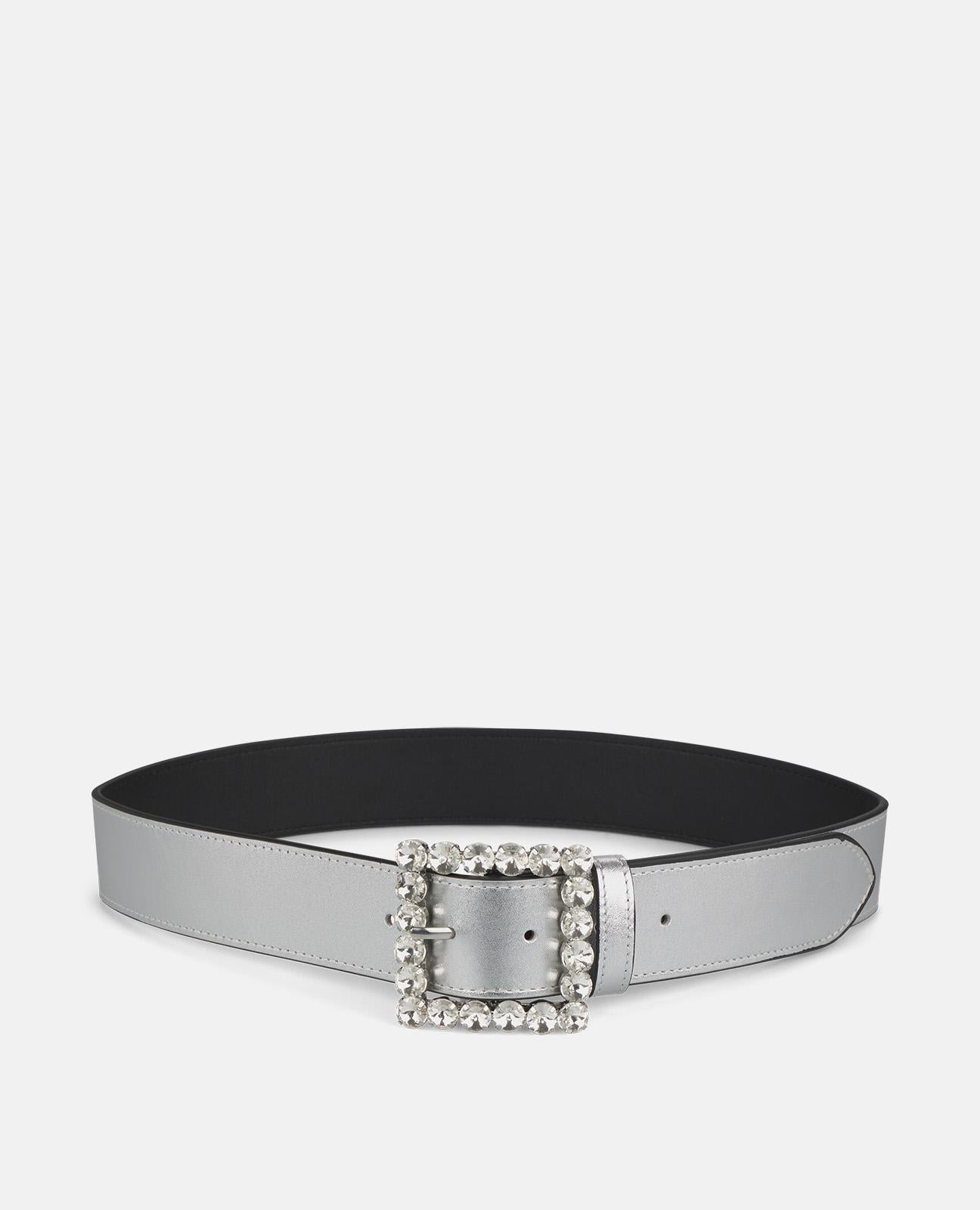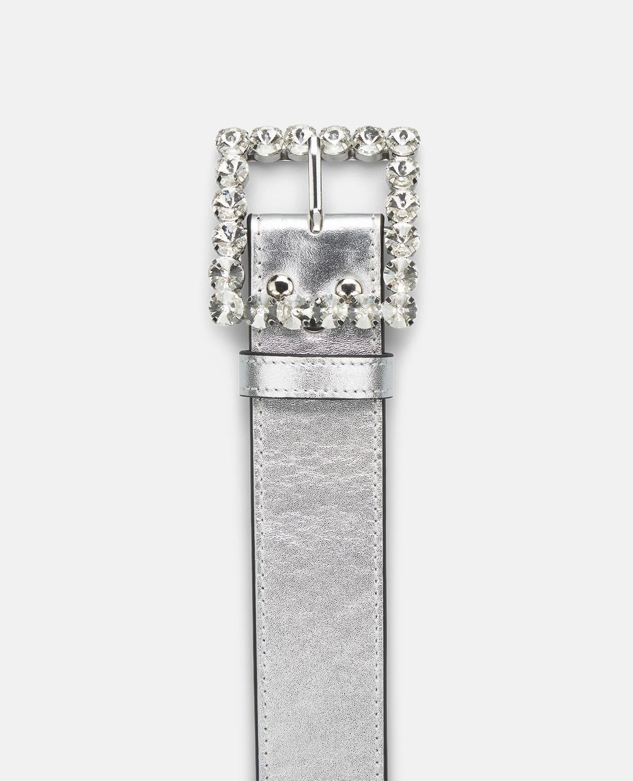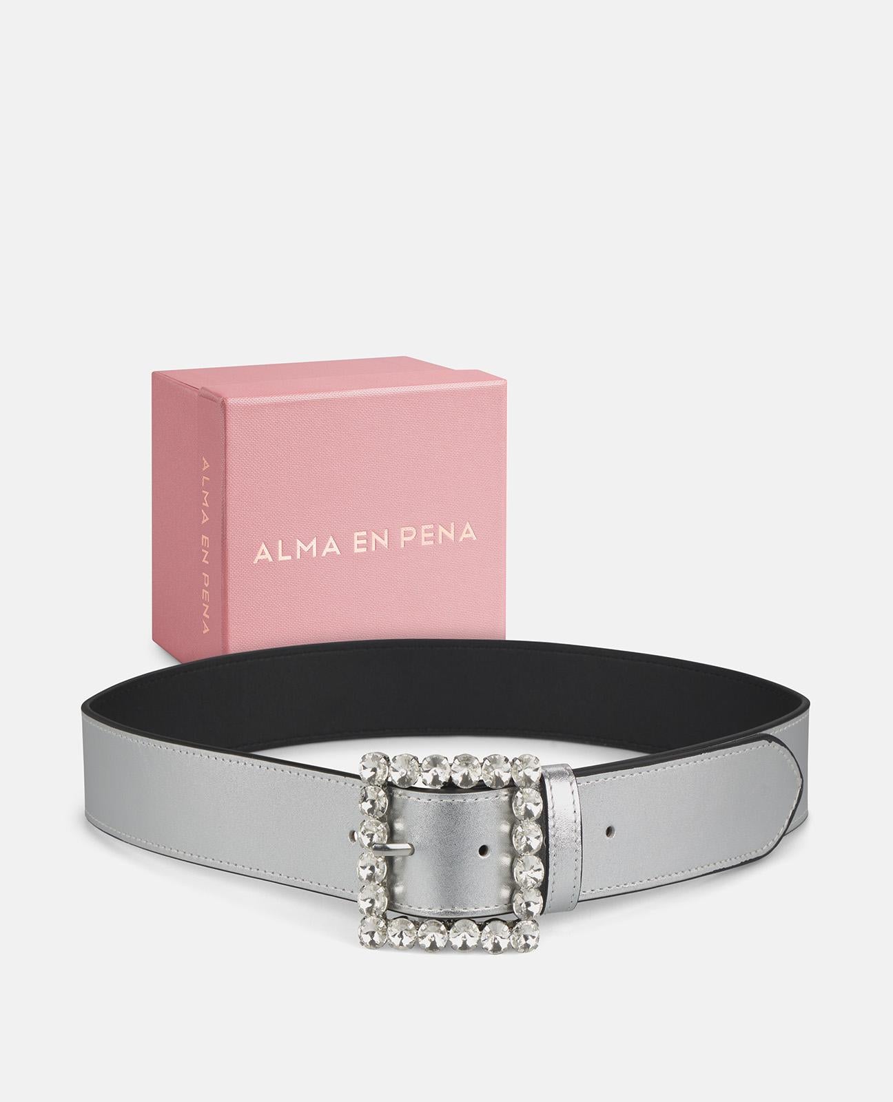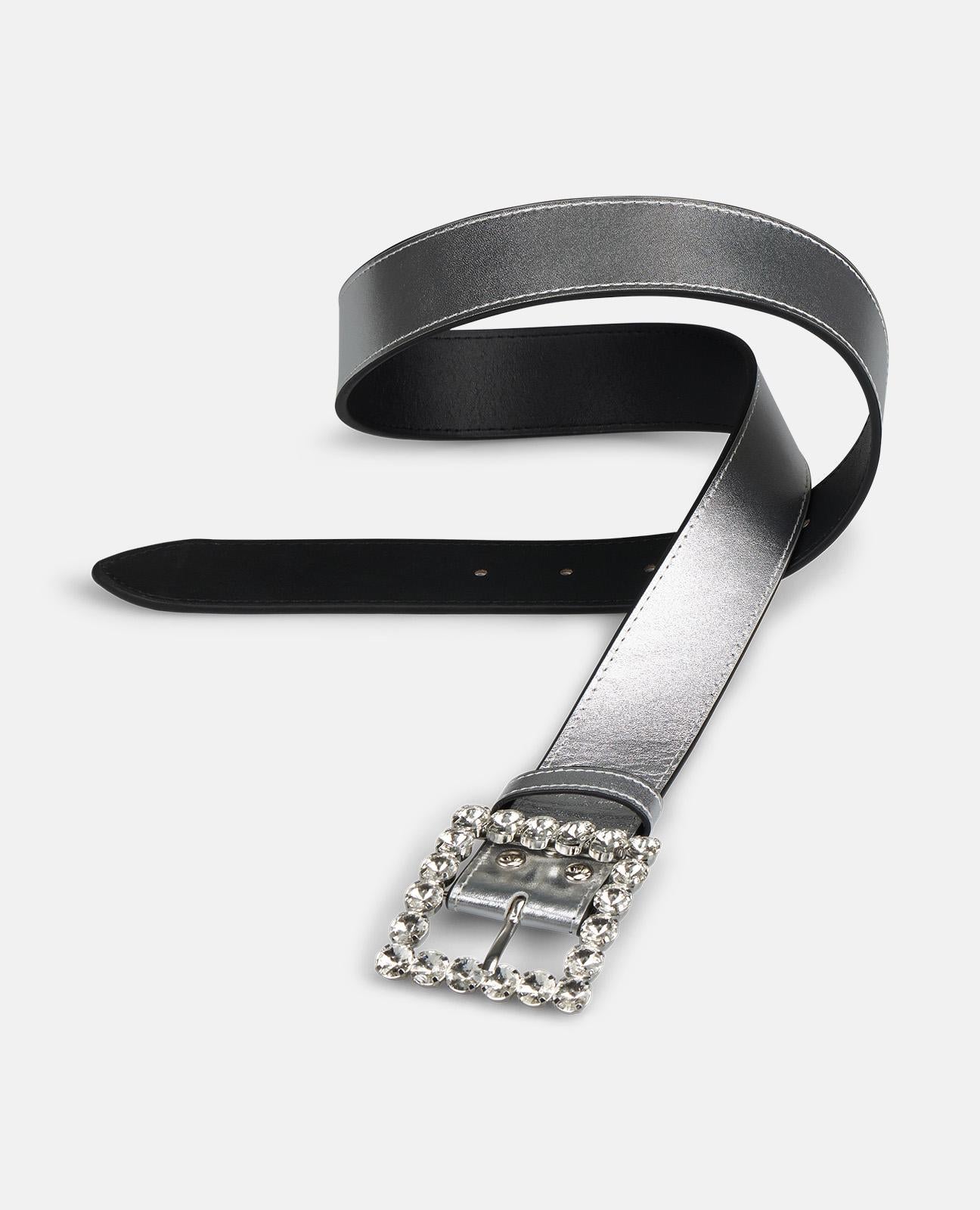 Cinturón de 4 cm de ancho realizado en piel. Hebilla metálica cuadrada con detalles de pedrería.