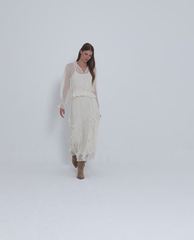 Blusa de mujer semitransparente con volantes. Con cuello en pico y manga larga. Cierre frontal con botones. Las medidas de la modelo vistiendo la talla S son: altura 1,68cm, pecho 87cm, cintura 63cm y cadera 88cm.