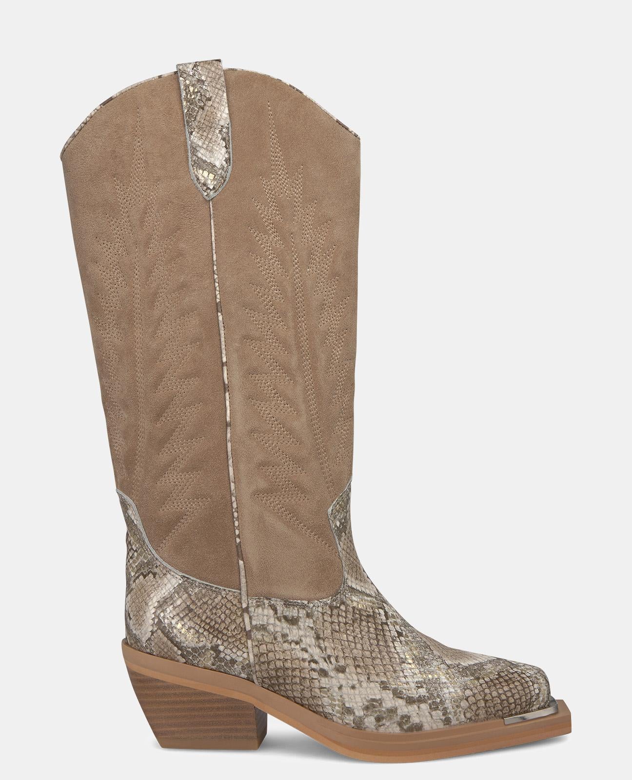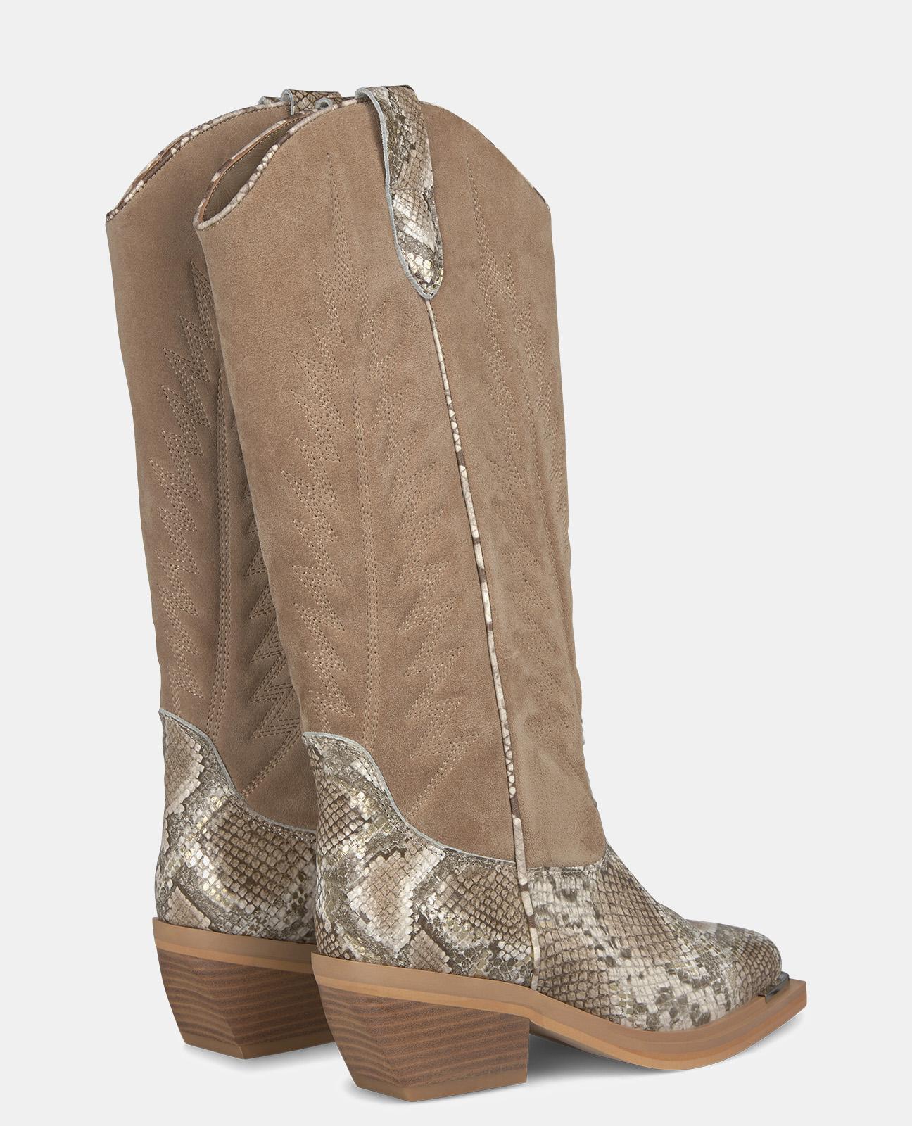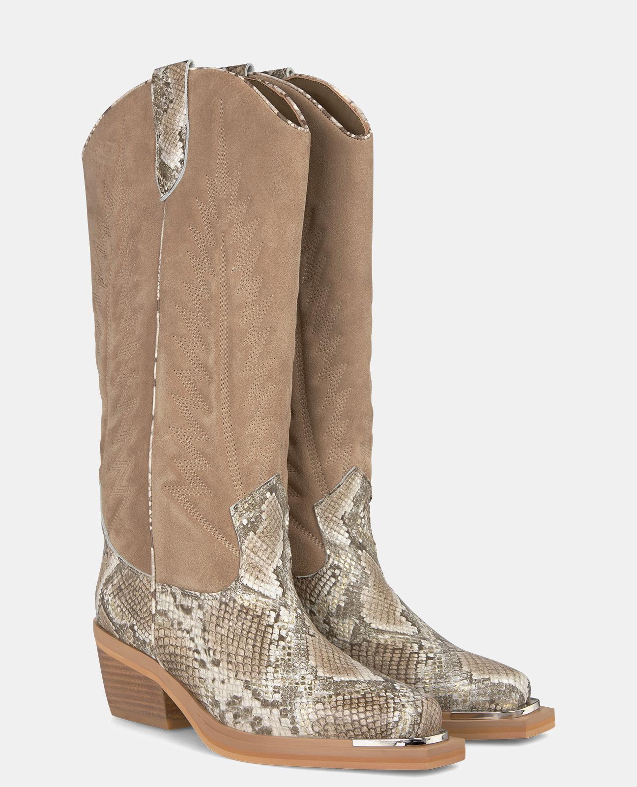 Bota de cano liso combi para mulher com bordado no cano. Com biqueira quadrada, em pele. A altura do salto é de 6cm e o cano da bota mede 30cm.
