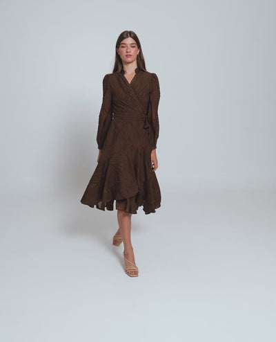 Vestido de mujer jacquard con manga larga, falda midi con vuelo y cierre con nudo atado a la cintura. Con escote en pico. Confeccionado en algodón y nailon. Las medidas de la modelo vistiendo la talla S son: altura 1,68cm, pecho 87cm, cintura 63cm y cadera 88cm.