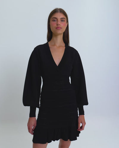 Vestido curto de senhora com mangas compridas bufantes. Decote em V, saia com acabamento em folho. Com decote alto. Confeccionado em viscose e nylon. As medidas da modelo que veste o tamanho S são: altura 1,68cm, peito 87cm, cintura 63cm e anca 88cm.